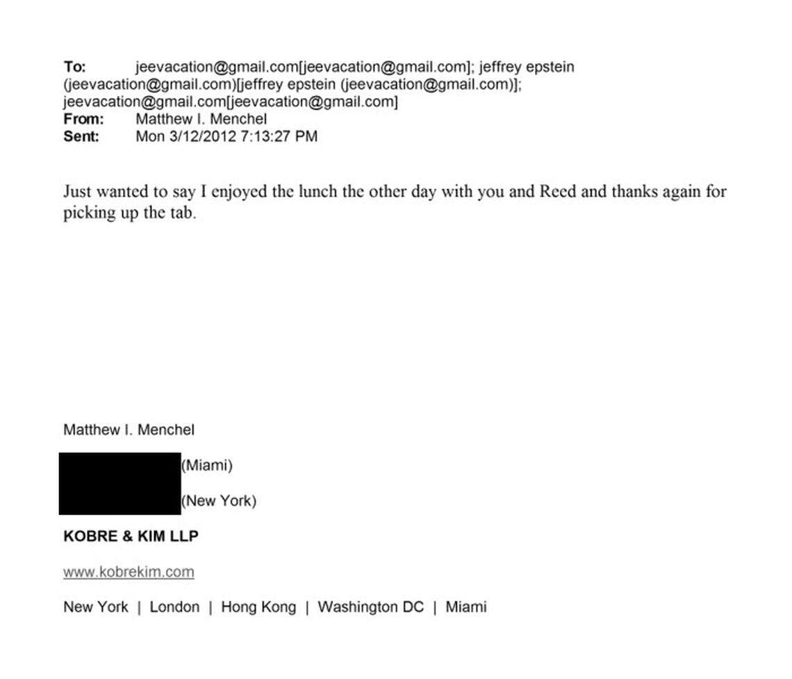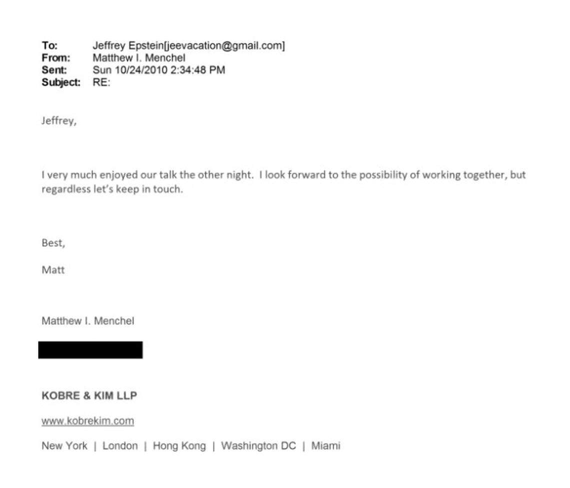 “Jeffrey, disfruté mucho nuestra charla la otra noche. Espero con ansias la posibilidad de trabajar juntos, pero de todas formas, mantengámonos en contacto. Saludos, Matt”, escribió Menchel en octubre de 2010, tres meses después de que Epstein cumpliera su condena.