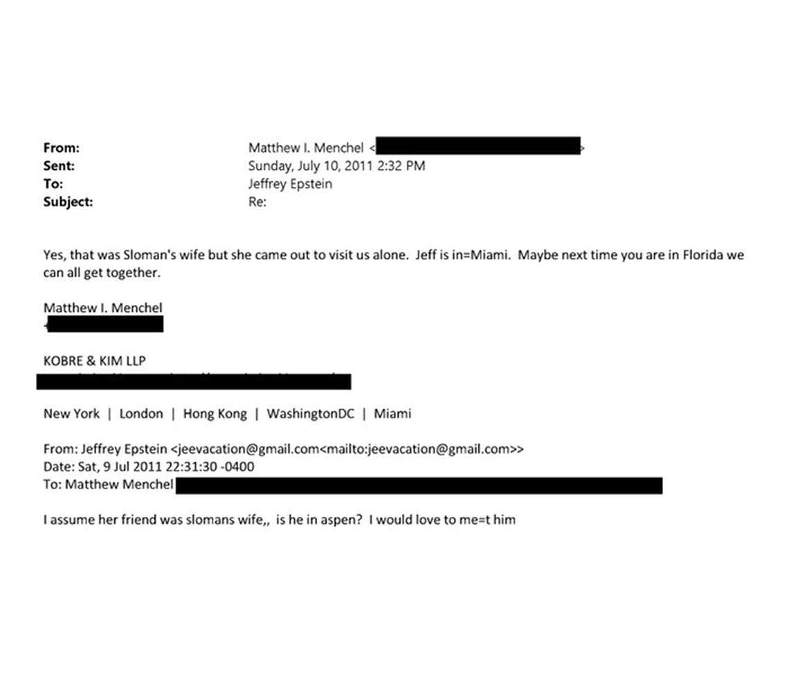 En julio de 2011, Epstein le escribió a Menchel cuando se encontró con la esposa de Sloman en Aspen. “Supongo que su amiga era la esposa de Sloman. ¿Está en Aspen? Me encantaría conocerlo”.