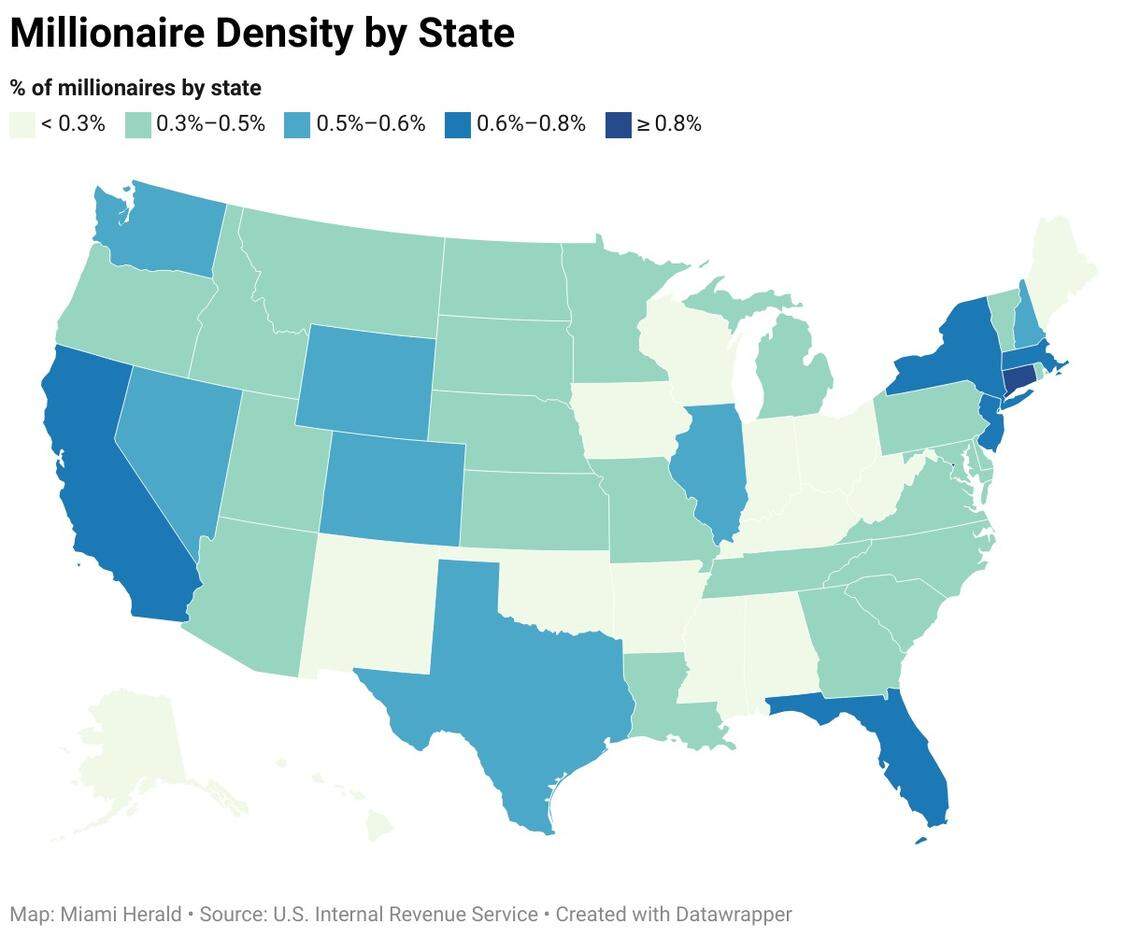 Los datos del IRS muestran que, en 2022, siete de cada 1,000 floridanos ganaron más de $1 millón al año, la quinta tasa más alta de cualquier estado. Esto representa un aumento con respecto a los cuatro millonarios por cada 1,000 floridanos de 2019.