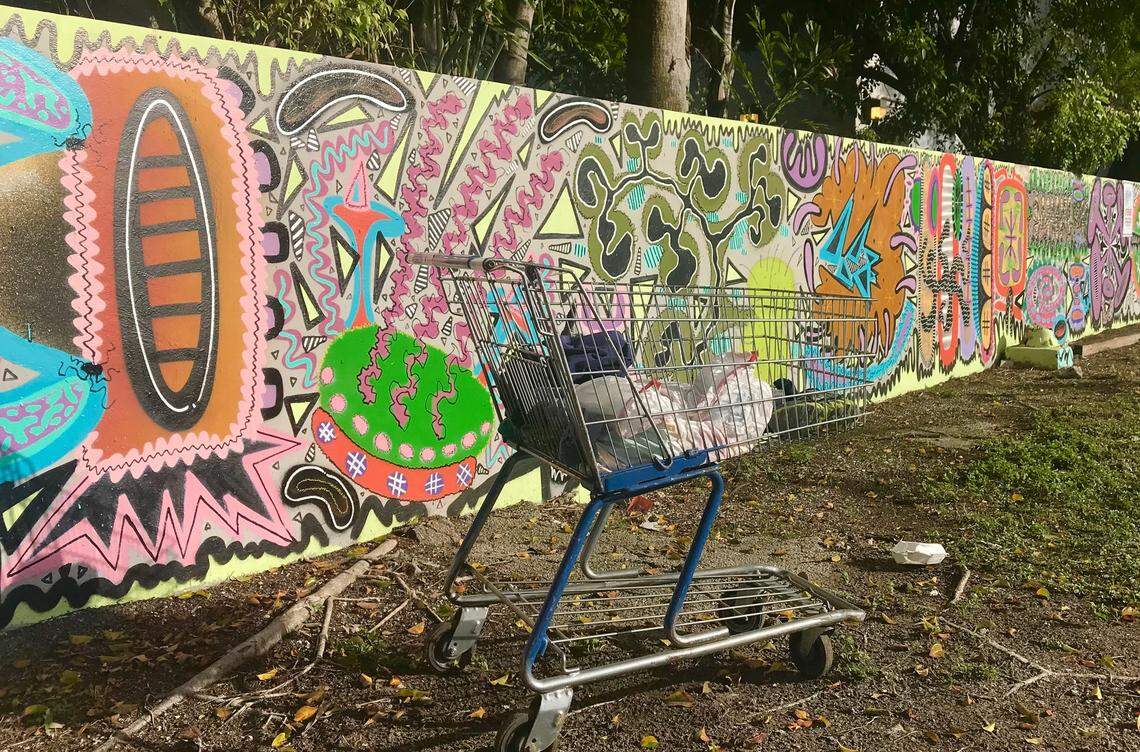 Benítez vive en la NW 17 Street, debajo de la I-95. Su vecino Keith Jenkins, conocido como “Ebony”, tiene sus pertenencias escrupulosamente organizadas en su carrito con zapatos talla 13, frazadas, artículos de higiene personal, velas, un almanaque y comida para gatos. Sus abrigos y vestidos buenos cuelgan de una cerca de alambre junto a un letrero que dice ‘No pasar”.