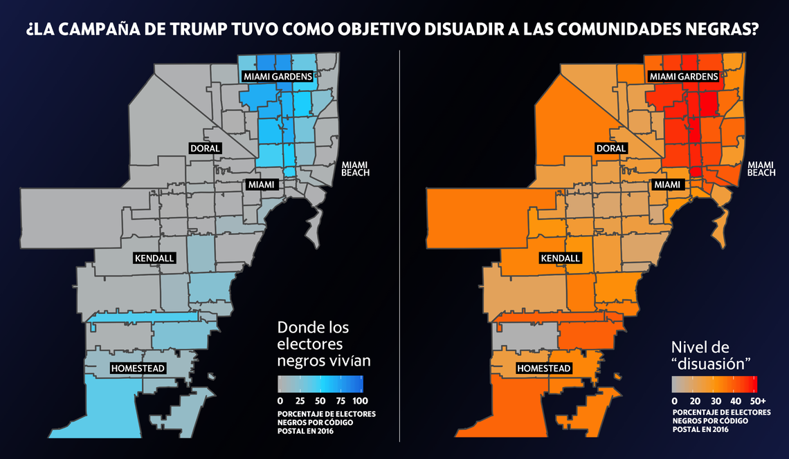 La campaña se enfocó en estos electores con anuncios desinformación y mensajes engañosos diseñados para convencerlos de perder la fe en Hillary Clinton y no salir a votar, según una investigación del Miami Herald y Channel 4 News del Reino Unido, que obtuvo exclusivamente una gran cantidad de información interna de la campaña de Trump a partir de 2016.