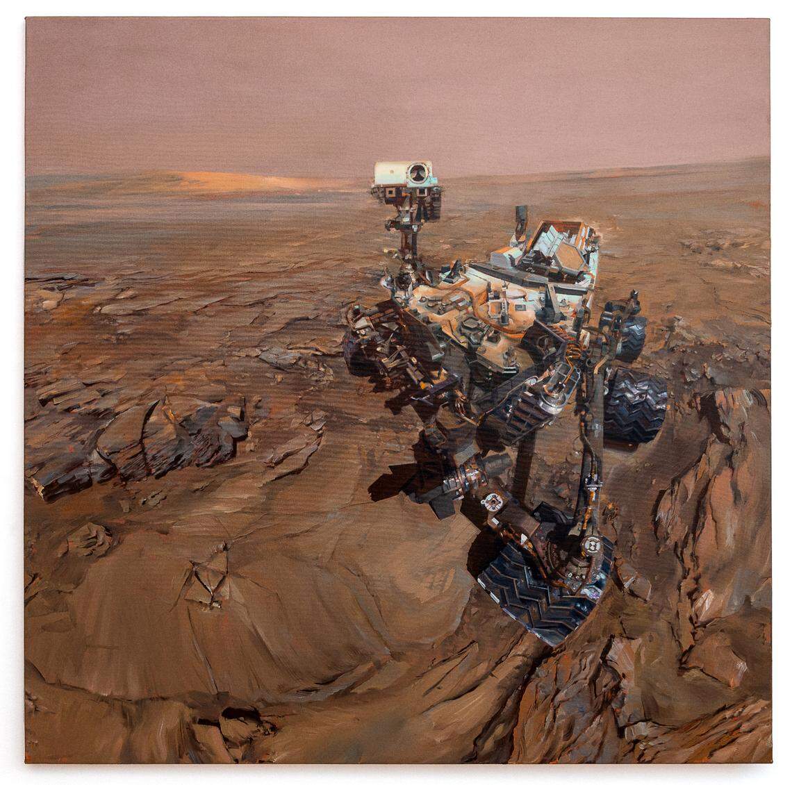 En esas pinturas de Marte con perspectivas paisajística ampliada, la naturaleza esta aquietada, y esa quietud, esa desolación del planeta rojo solo parece romperse por la presencia de los rovers y otros artefactos cuya artificialidad contrasta con la ignota grandeza del mundo inédito que nos están revelando, como sucede por ejemplo en Autorretrato y Another Mars Winter. Obras de una poética neofigurativa realista citando el lenguaje del paisaje y sus modalidades de representación. Aquí la perspectiva y puntos de fugas desbordan el horizonte del cuadro, citando estilos de grandes paisajistas románticos del siglo XVIII y XIX como son los casos, por ejemplo, de Albert Bierstadt, pintor estadounidense de ascendencia alemana (Solingen, Alemania, 1830- N. York, USA,1902). Distinguido por sus monumentales escenas del Oeste de Estados Unidos, que cita Rodríguez en Autorretrato con el rover a la derecha. En Santa María Crater, (2022) Rodríguez cita a William Turner (Reino Unido, 1775-1851), en su obra The Lake of Zug, (1843). Pintura sobre los maravillosos parajes de lagos en los Alpes Suizos. Pero en Santa María Crater, Rodríguez pinta este cráter marciano, parafraseando la pintura de Turner, con un aura luminosa azul, denotando la presencia de agua, cuando en realidad Marte es terriblemente seco.